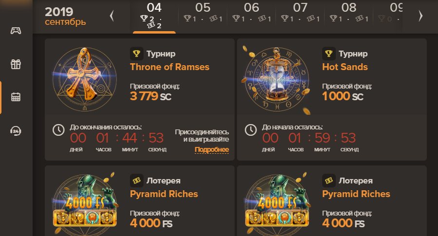 Кроме того в клубе предусмотрены и другие предложения, не зависящие от бонусной программы. Например, акция Pharaons Set, где участник получает 40% к сумме депозита и 40 вращений без ставок. Но при этом нужно выполнить одно условие – пополнить счет на 50$ и долее.